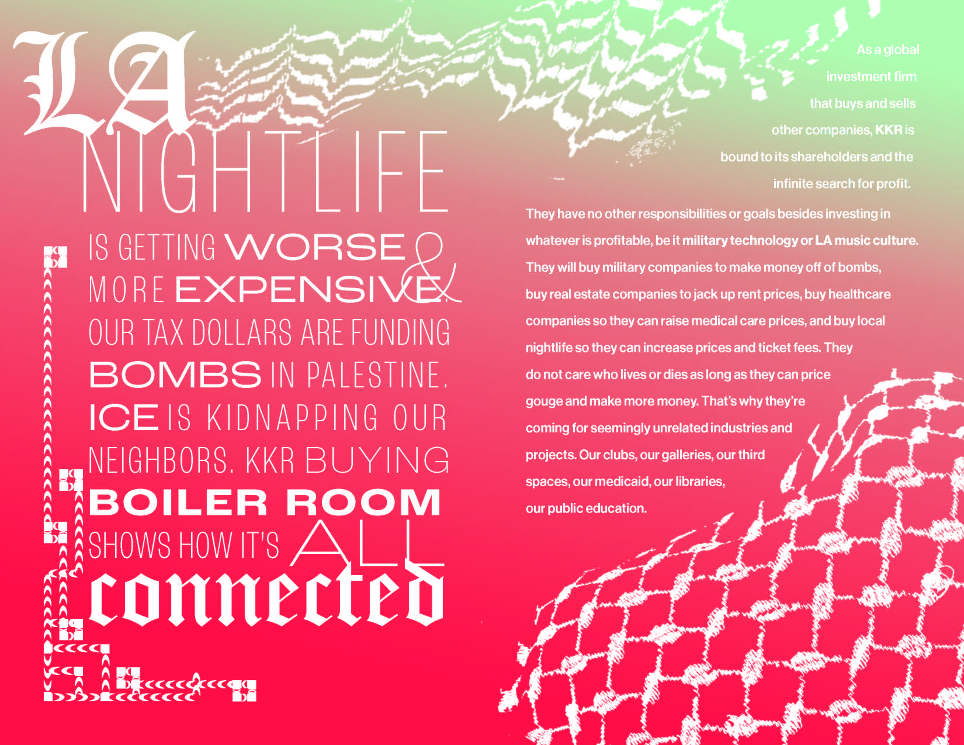 Informational zine given to attendees on their way out. We were intentional about this to maintain the party atmosphere and to get them thinking about the issues once they were home.